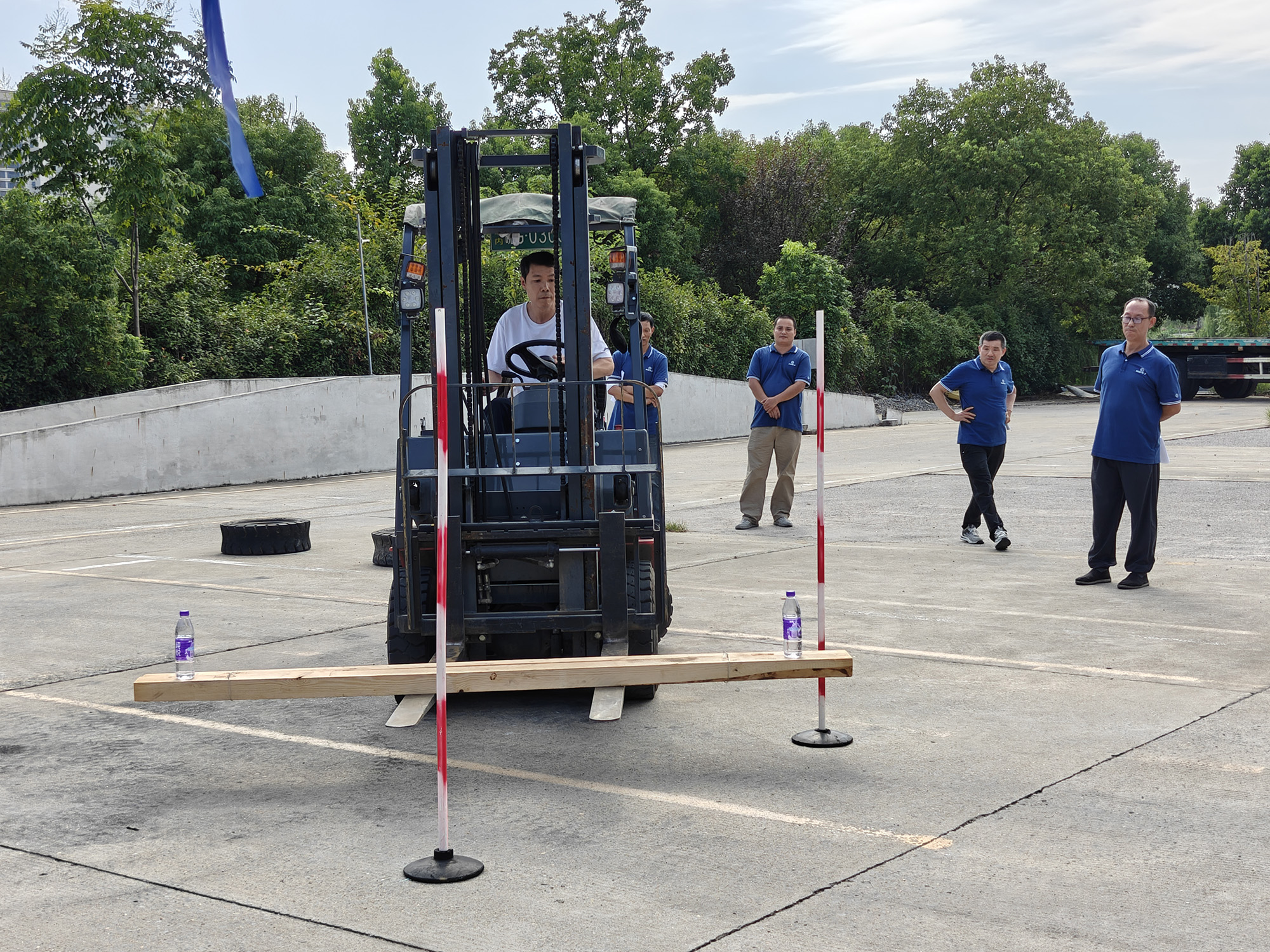 叉車技能比武側(cè)重于選手的操控熟練性與心理素質(zhì)。項目設(shè)置緊密貼合實(shí)際作業(yè)場景,要求選手在限定時間內(nèi)完成轉(zhuǎn)向往返、托盤精準(zhǔn)移庫碼放等動作,并在繞障礙物操作過程中確保托盤上礦泉水瓶保持穩(wěn)定,不得掉落。競賽不僅要求速度,更注重操作的平穩(wěn)性與準(zhǔn)確性,充分體現(xiàn)出高標(biāo)準(zhǔn)的作業(yè)要求。